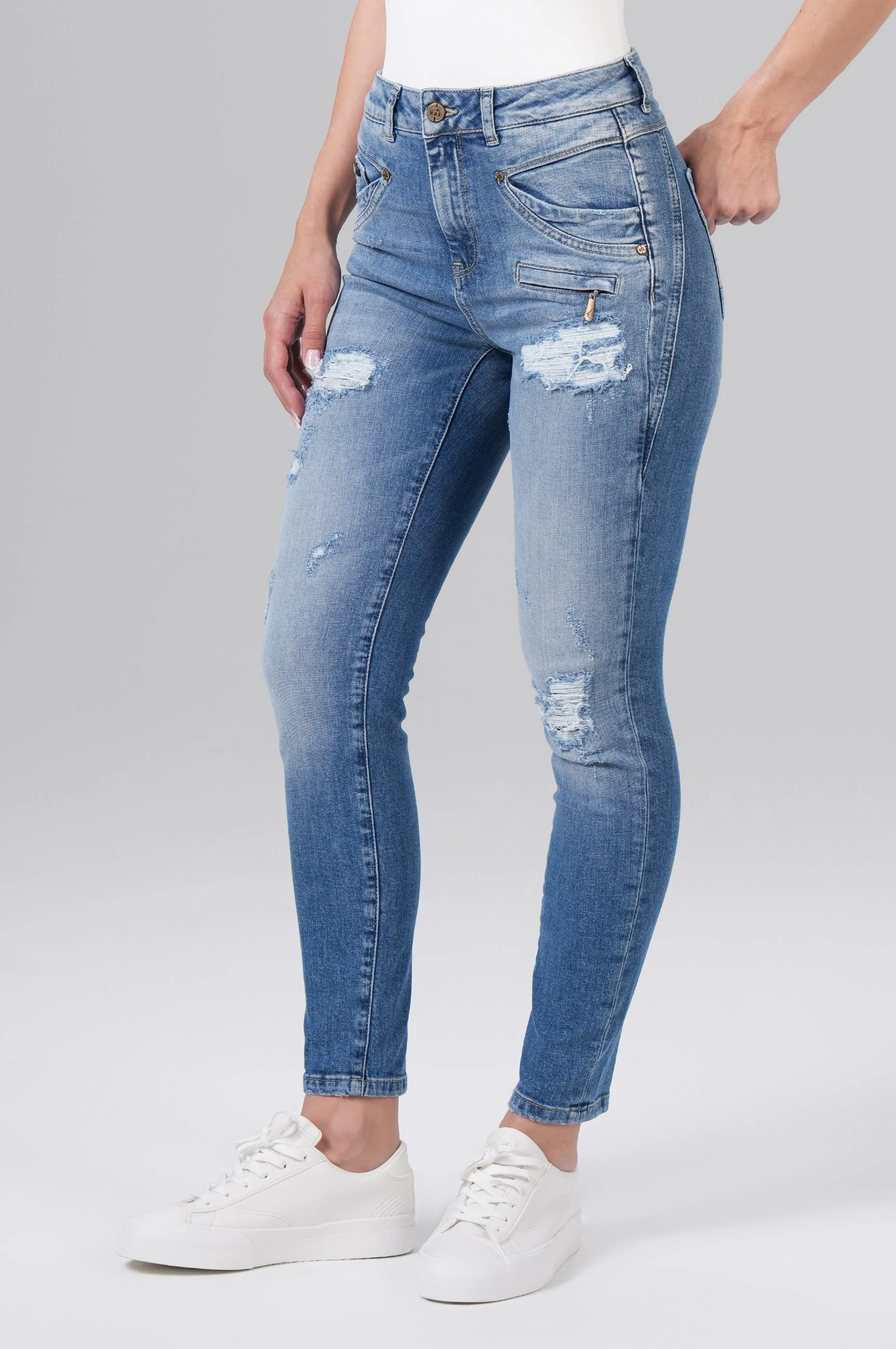 Die “Suzy Skinny Fit” von M.O.D besticht durch ihren schmalen Schnitt und den elastischen Denimstoff, der für eine perfekte Passform sorgt. Die Destroyed-Details verleihen der Hose einen modernen, lässigen Look, während der vordere Reißverschluss zusätzlichen Komfort bietet. Diese Hose ist die perfekte Wahl für einen angesagten Look, der sowohl im Alltag als auch bei besonderen Anlässen überzeugt.